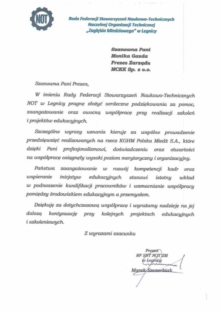 Z przyjemnością informujemy, że Pani Prezes Monika Gazda otrzymała podziękowania od Naczelnej Organizacji Technicznej.